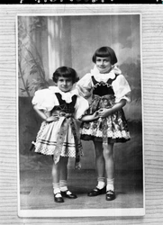 Jan Bystřický (1934). The photograph shows his sisters Antonie and Božena Bystřická in the folk costume of the Haná region in the early 1930s. The family was saved from persecution thanks to a warning from a gendarme. Gendarmes from Vyškov as well as a criminal inspector in Brno helped achieve their release from the Provincial Labour Enforcement Camp, where they were interned.